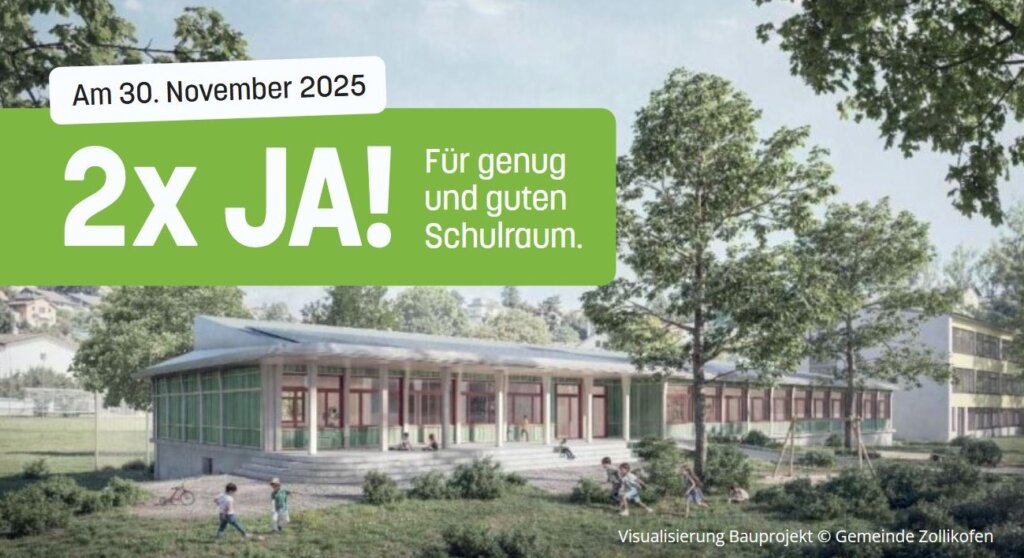 • 2 x JA für genug und guten Schulraum, nämlich 1 x JA zum Neubau auf dem Schulanlage Steinibach (für Kindergärten, Mehrzweckraum und Tagesschule) und 1 x JA zum Budget 2026 mit gleichbleibender Steueranlage 1.40 (Variante 1)
