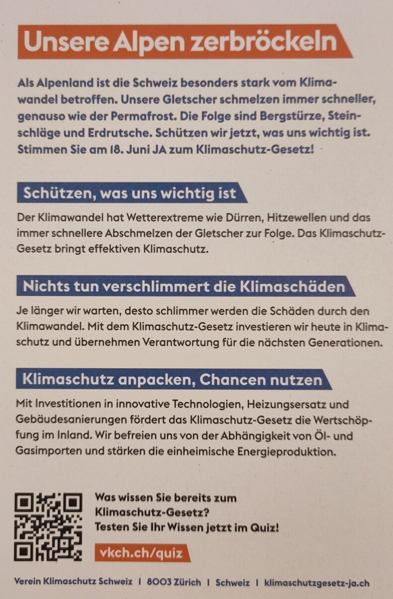Im Rahmen einer schweizweiten Aktion des Trägervereins der „Gletscherinitiative“ in mehreren Dutzend Gemeinden sind am 1. April auch in Zollikofen wichtige Flugblätter verteilt worden: „Kein Scherz: Unsere Alpen zerbröckeln“, hat es darauf geheissen: „Schützen Sie am 18 Juni, was Ihnen wichtig ist.“ Deshalb: JA zum Klimaschutz-Gesetz am 18. Juni. An der Verteilaktion bei windig-kaltem regnerischem Wetter haben in Zollikofen mehrere Freiwillige aus verschiedenen Parteien und Parteilose mitgemacht. Herzlichen Dank dafür an Anna, Ine, Maria, Bene, Andreas und … !