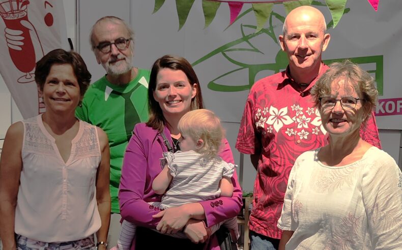 Fürs GFL-an-der-GAZ-OK: Marceline Stettler, Edi Westphale, Anne-Lise Greber-Borel, Bruno Vanoni – und weitere Mithelfende am GFL-Stand und im Hintergrund: Martin Wronna, Edith Vanoni, Donia und Jean Pierre Rosat, Markus Züger, Claudia Degen, Hans Brüngger, Flavio Baumann, Laura Marti