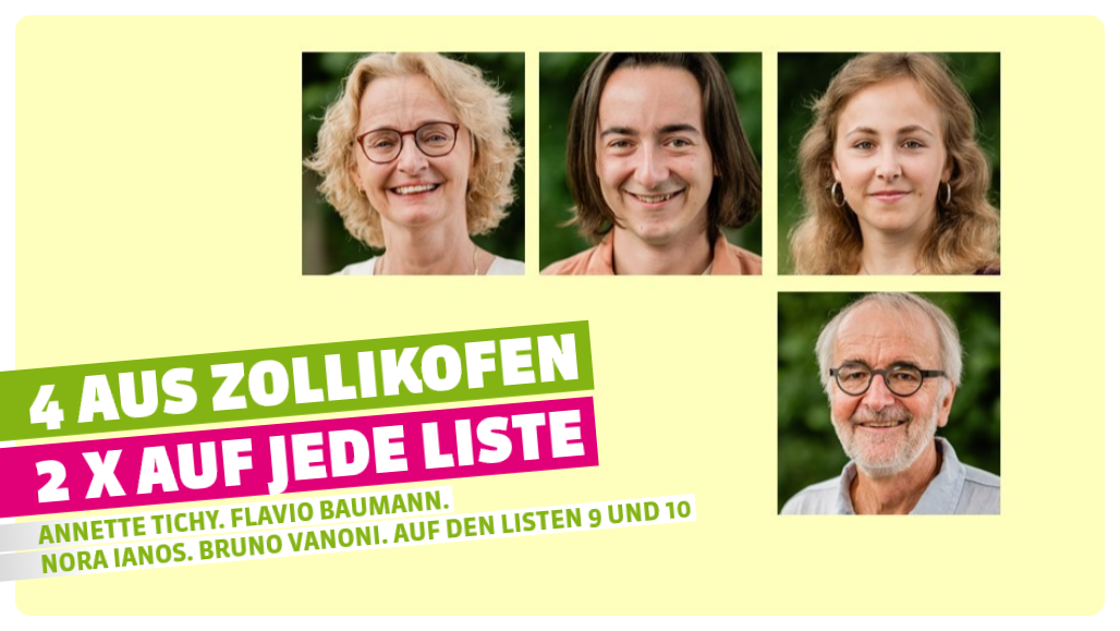 Aus GFL-Sicht gehören diese vier Kandidierenden aus Zollikofen doppelt auf jede Wahlliste. Am besten auf die Wahlliste Nr. 9 GRÜNE oder Nr. 10 Junge Grüne. Herzlichen Dank für jede Stimme!